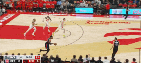高位横向掩护愚弄CC拉开弧顶空间,里德接球后弧顶一双一,径直走左侧愚弄无邪性强突珀尔特尔并完成左手斥逐。