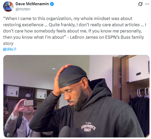 赛后谈到此前ESPN长文爆料珍妮对自己不满,詹姆斯表示:我认为我和珍妮的关系很好,我们之间一直存在着尊重和良好的合作关系,拜托,伙计们。别把事情想得太复杂了。