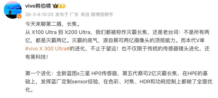 据悉,vivoX300Ultra将搭载全新的蓝图x三星HP0传感器,官方称之为第五代蔡司2亿灭霸长焦。HP0在前代HPE的基础上,发达蓝厂定制sensor教养,在颜色、对焦、HDR和功耗扬弃上齐作念了全面优化。不据说感器尺寸和焦段暂时莫得说起,应该一经1/1.4英寸和85mm。