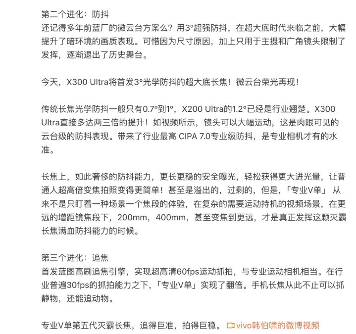 追焦方面,vivoX300Ultra首发蓝图高刷追焦引擎,罢了超高清60fps怒放合手拍,声称与专科怒放相机相配。